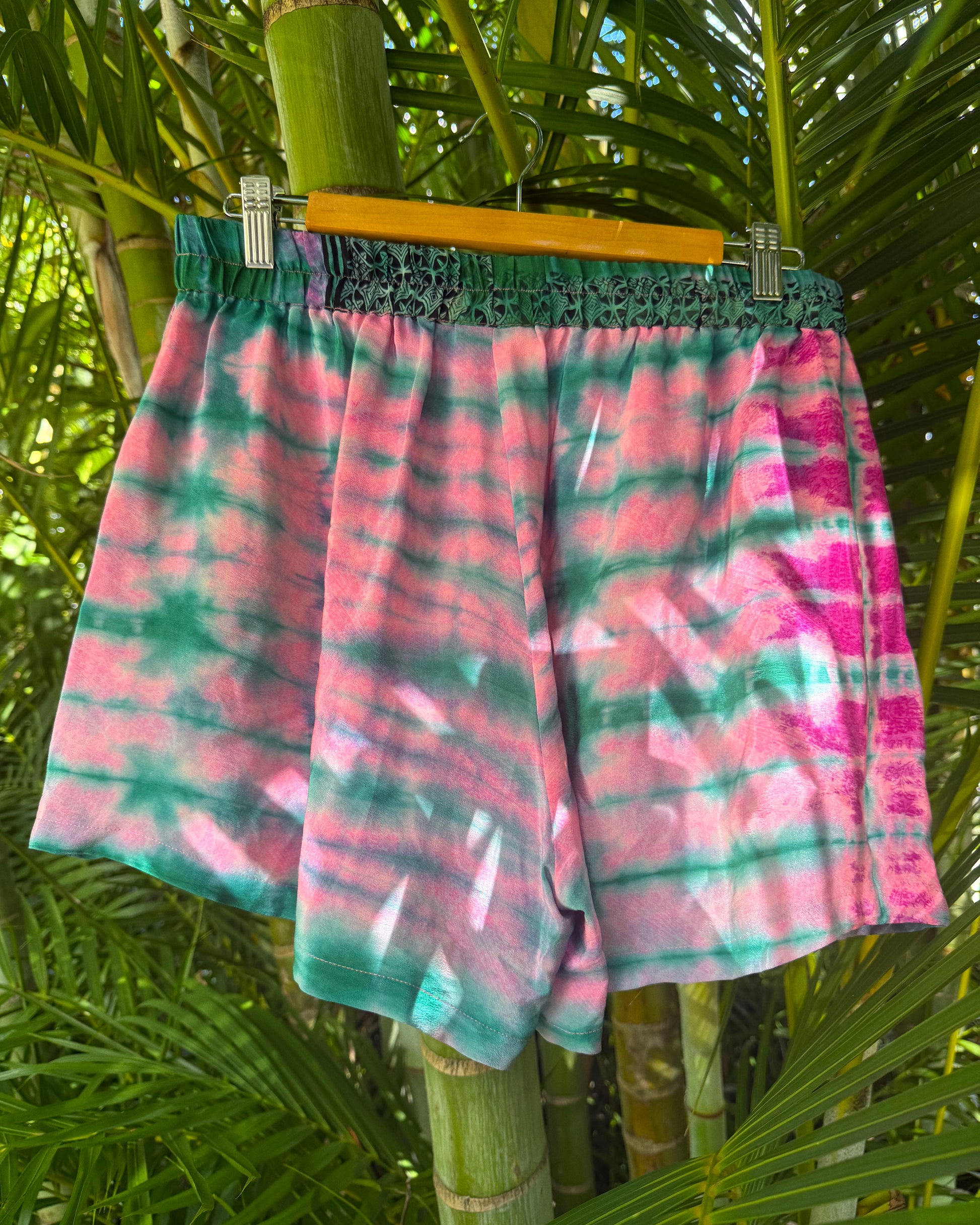 Our relaxed shorts are crafted from upcycled silk sarongs, transforming vibrant, storied fabrics into something new. Made from soft silk crepe, they drape beautifully and feel light against the skin.